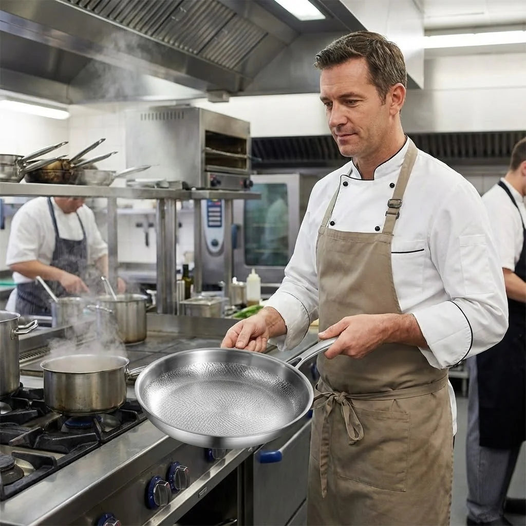 Wysokiej jakości stal oraz trwały materiał patelni zapewniają niezawodną i spójną wydajność w kuchni